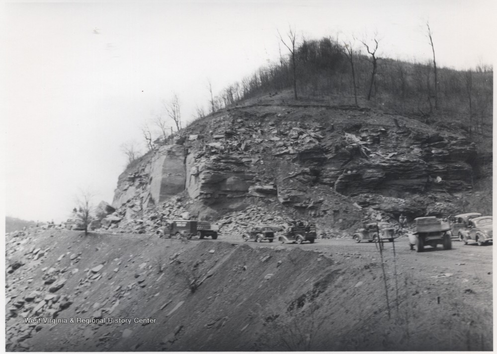 - A group of cars park around the area where the road is being built. To the left in the distance, construction workers are pictured.